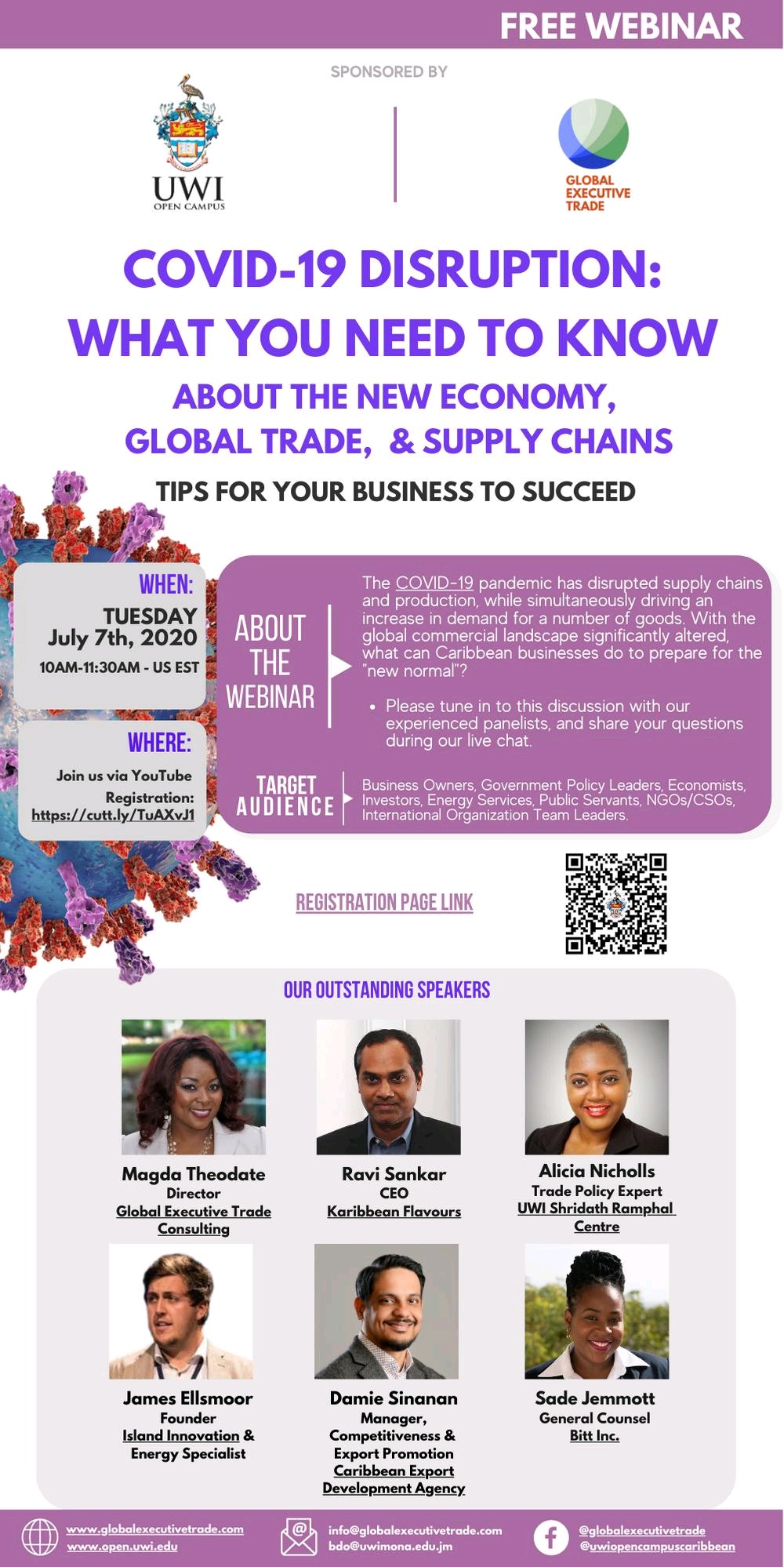 On Tuesday, July 7th, I am happy to be participating as a panelist in this free Webinar hosted by The University of the West Indies Open Campus’ Business Development Unit and Global Executive Trade! See flyer and below for further details.